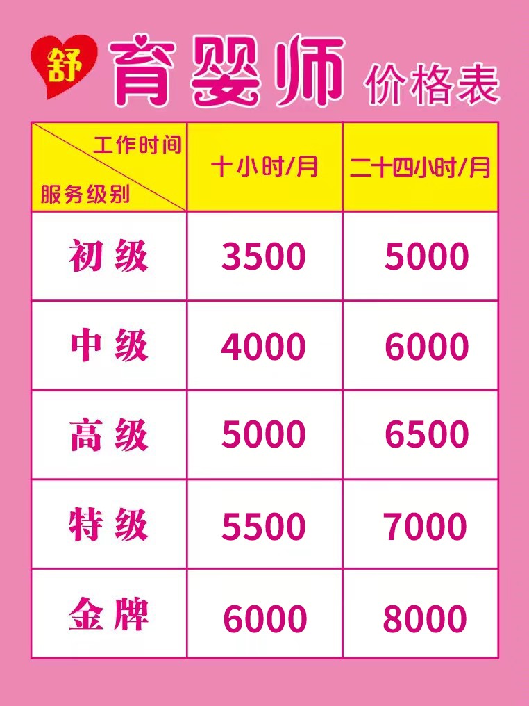 月嫂价格表: